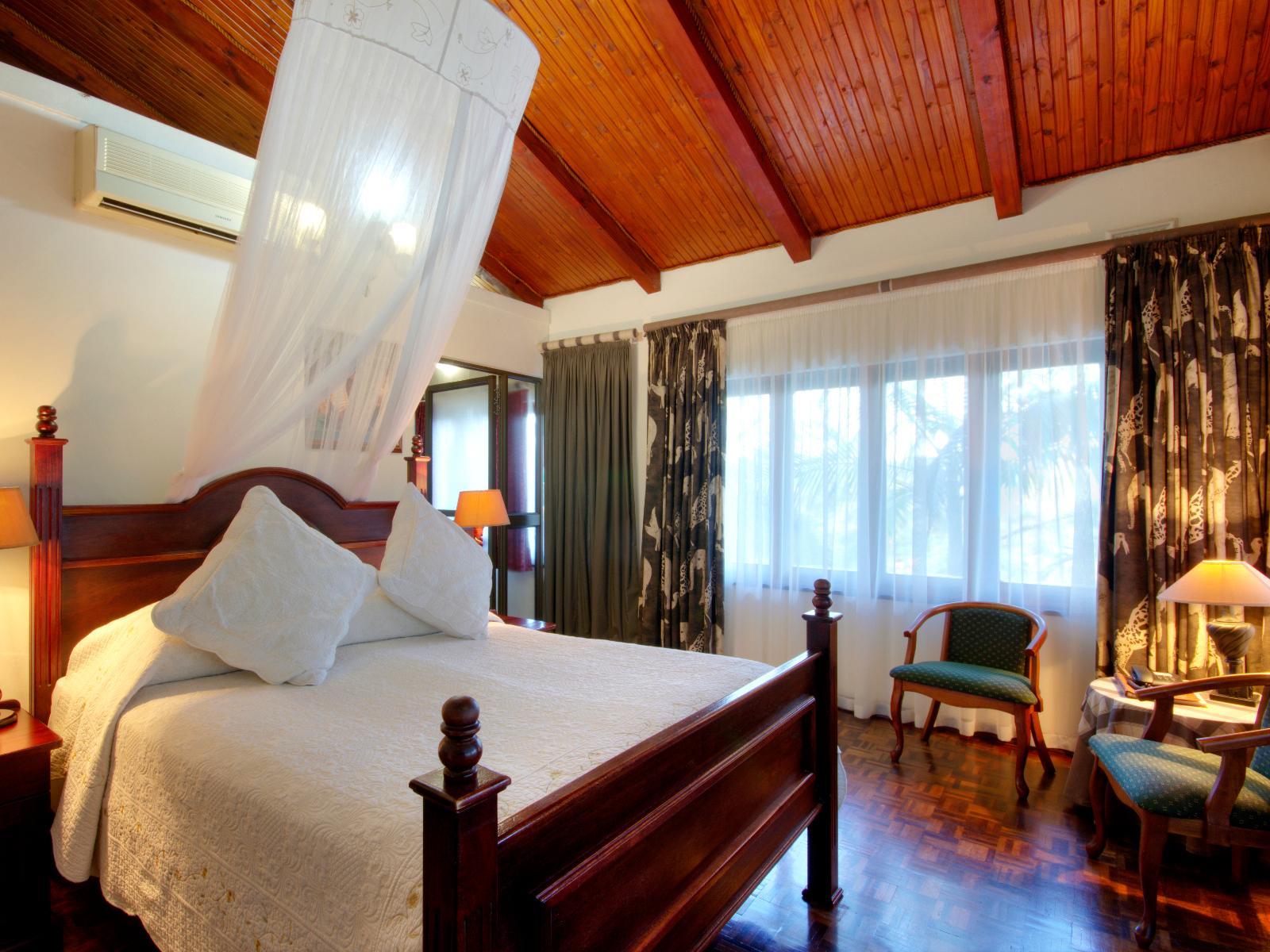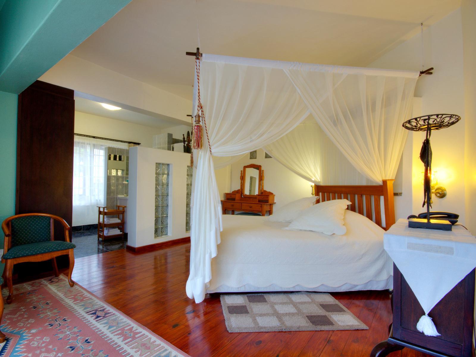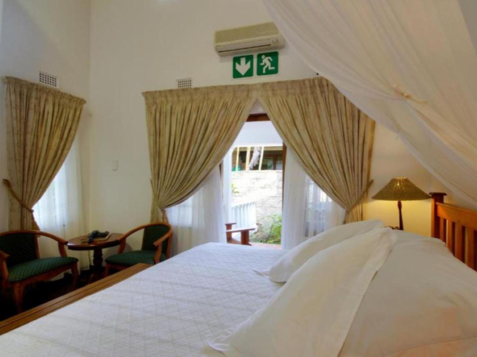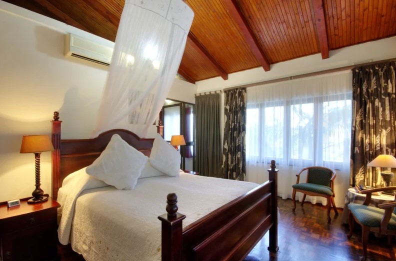 Spacious, own outside entrance, front facing with patio. King-size bed with mosquito net. Serviced daily, air-conditioned, telephone, wall safe, tea/coffee, hairdryer and fridge. Small en-suite bathroom with shower. Three towels per guest and toiletries.