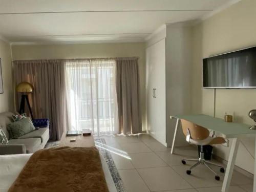 Modern executive studio apartment with all facilities. Smart TV with Netflix, Showmax. Premium linen. Lounge area. Fully equipped kitchen. Bathroom with shower, complimentary toiletries. Study desk. Unlimited Wi-Fi. Onsite parking. Prime, secure location.