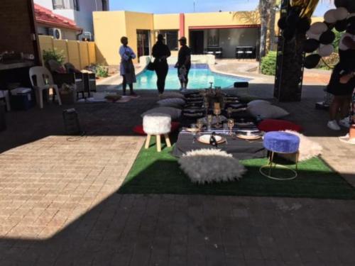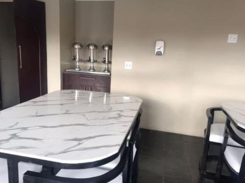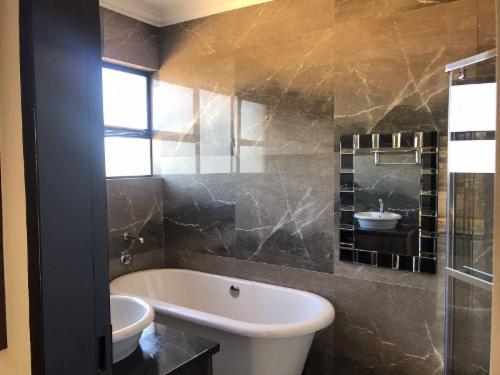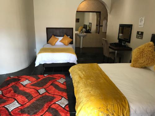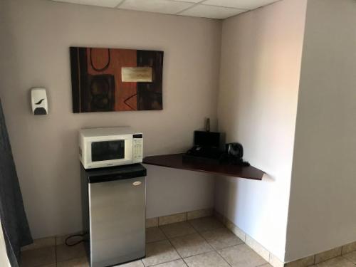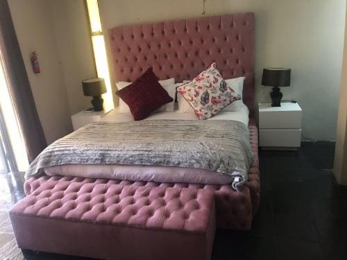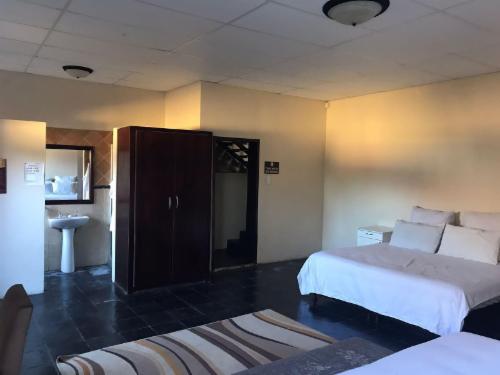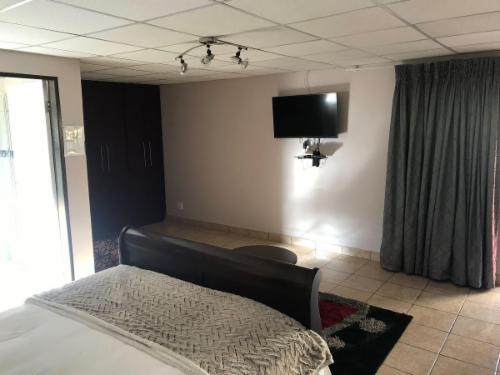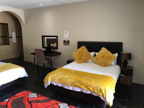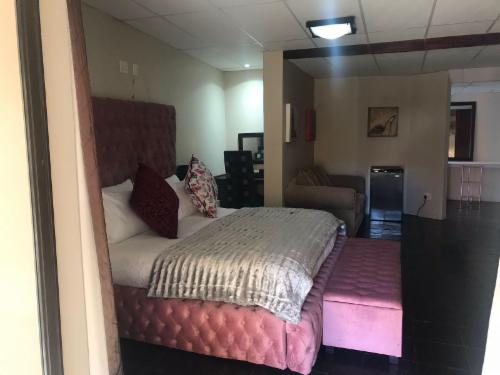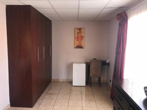 Dr. Moroka is a Suite that comes with a King Size bed, big pedestal, beautiful side lamps, Air-conditioning, Coffee/Tea Maker, DStv/Satellite, and Internet access. This room has a shower only.
