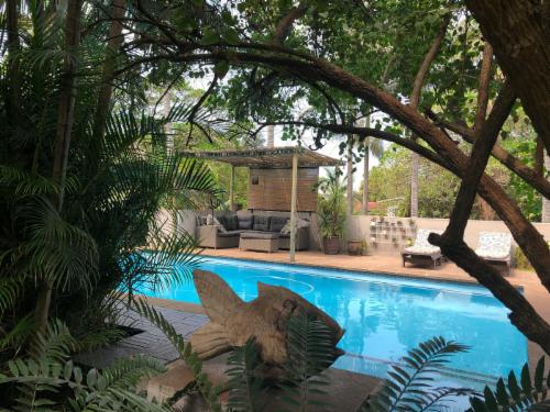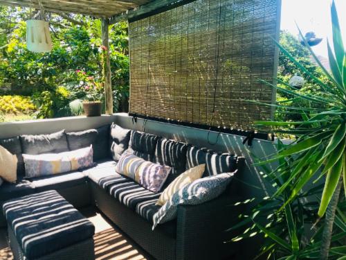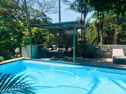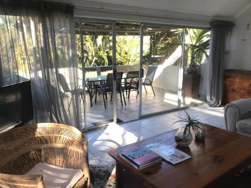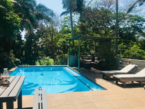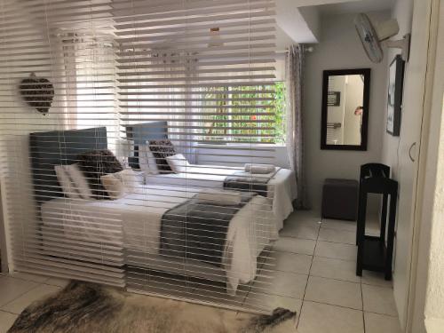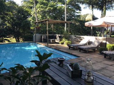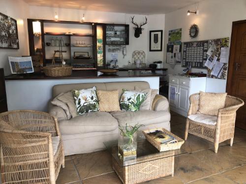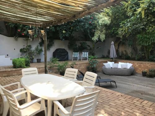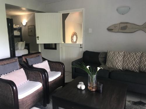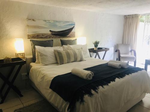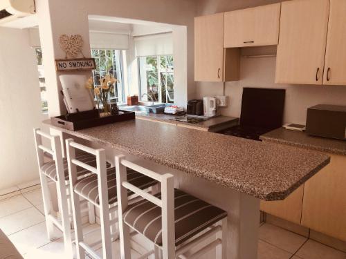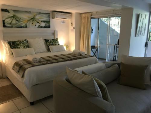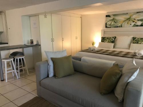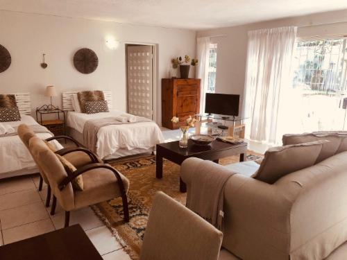 Open-plan, ground-level suite with a king-size bed, a lounge, kitchen and 1 bathroom with a shower. It has a private patio with a braai overlooking the gardens and pool. Pet Friendly. Self-catering. DStv and free Wi-Fi. Space for a camp cot for baby.
