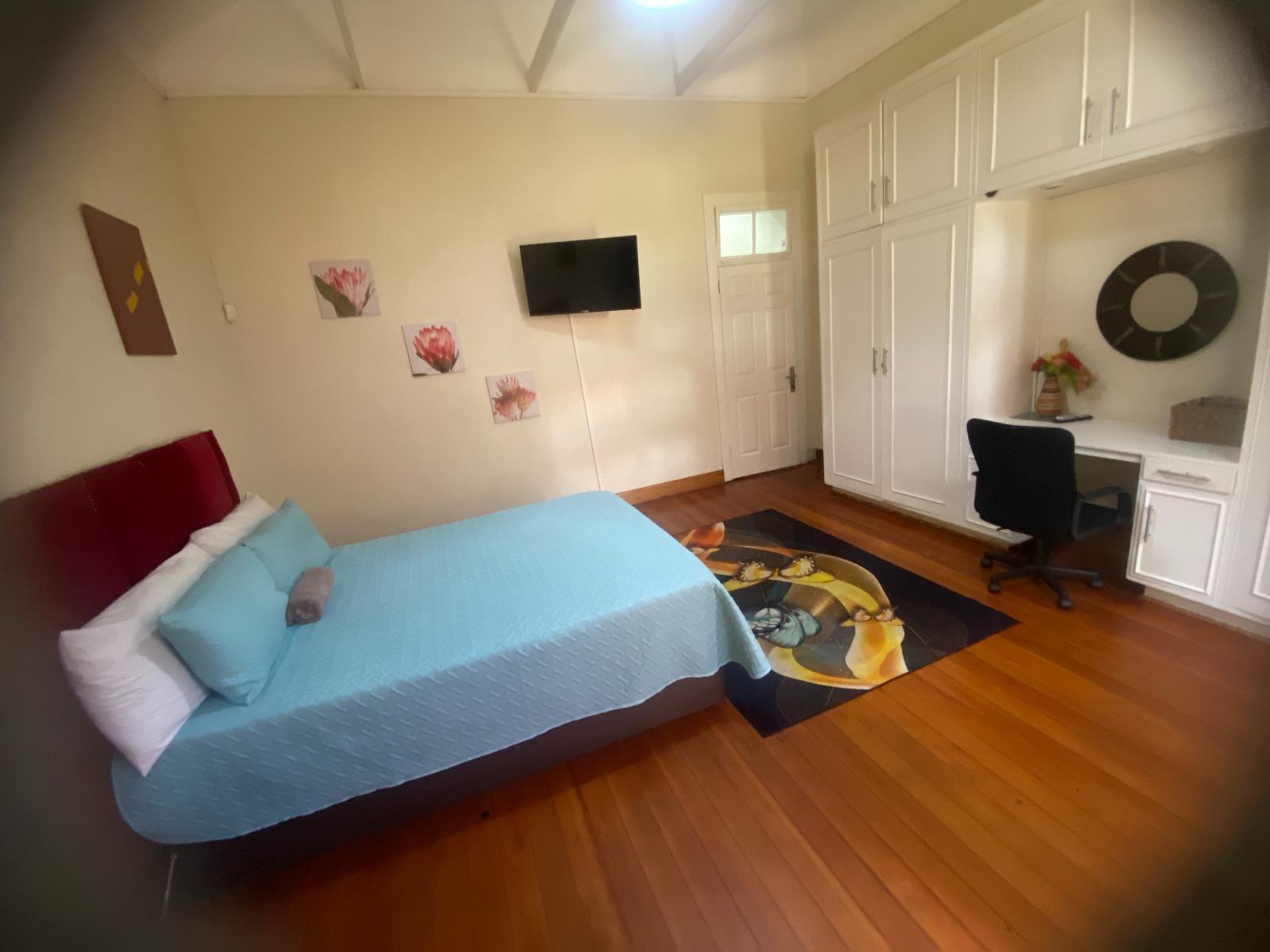 This room is furnished with a tri-bunk bed, 1 double bed, and 2 single beds, and the room has a private bathroom. This room contains a TV for media entertainment, free Wi-Fi access, tea/coffee facilities, air-con, and other amenities for convenience.