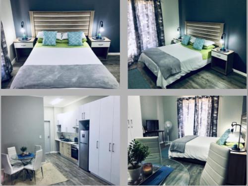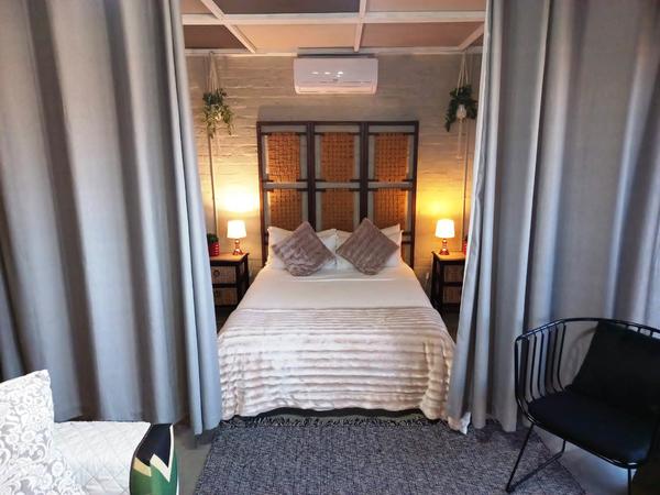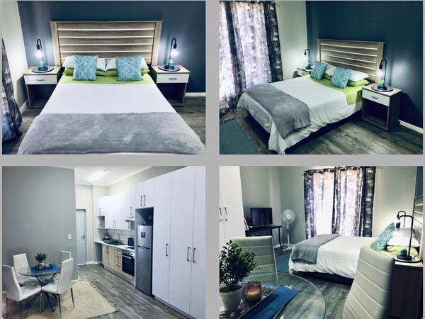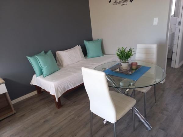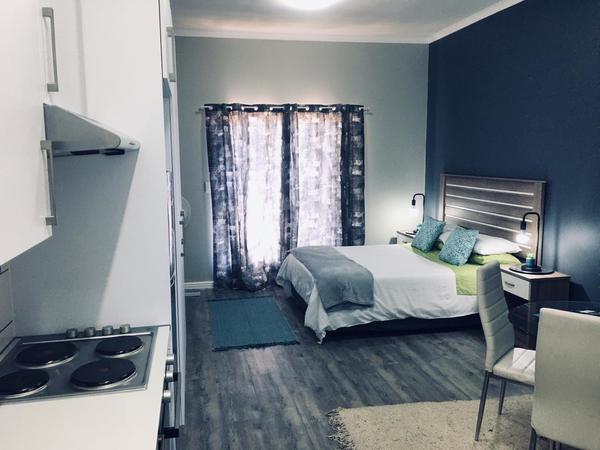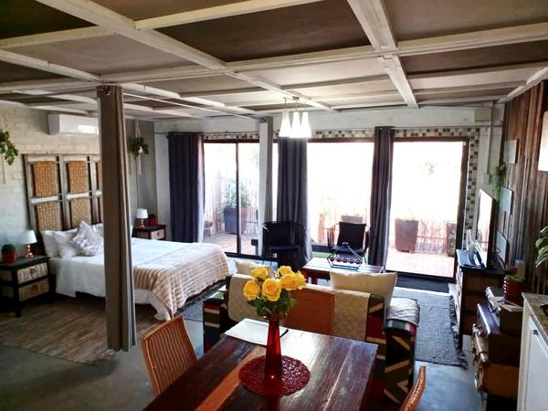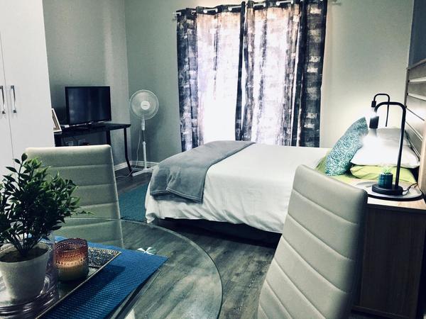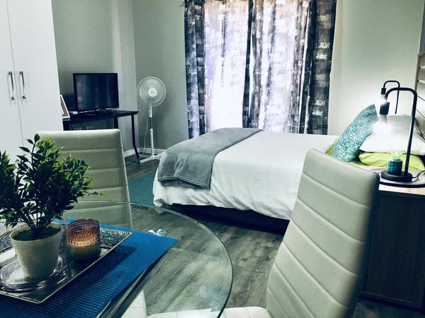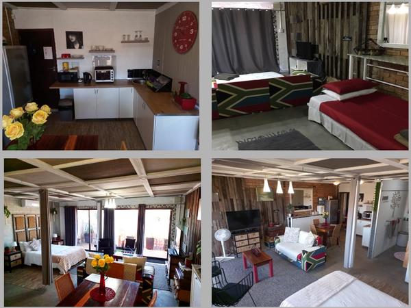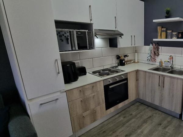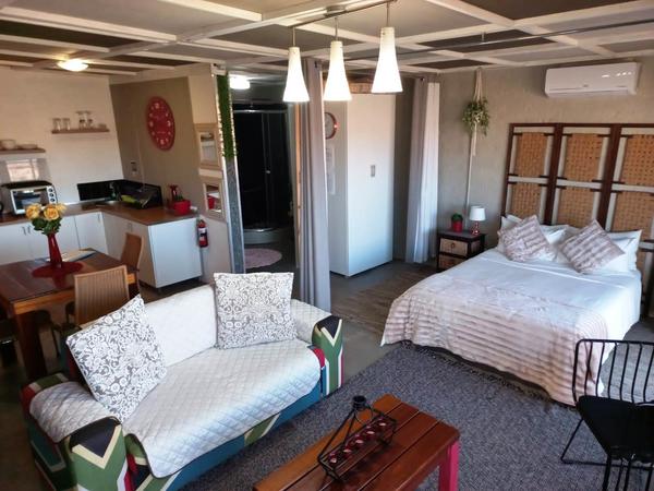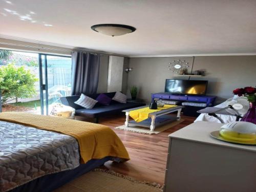 The apartment offers a separate entrance, a living room, kitchen, and en-suite bathroom. The open-plan apartment offers a double bed, a single wall bed, an extra mattress, a sleeper couch, and a small dining table. The room has a TV, free Wifi and air-con