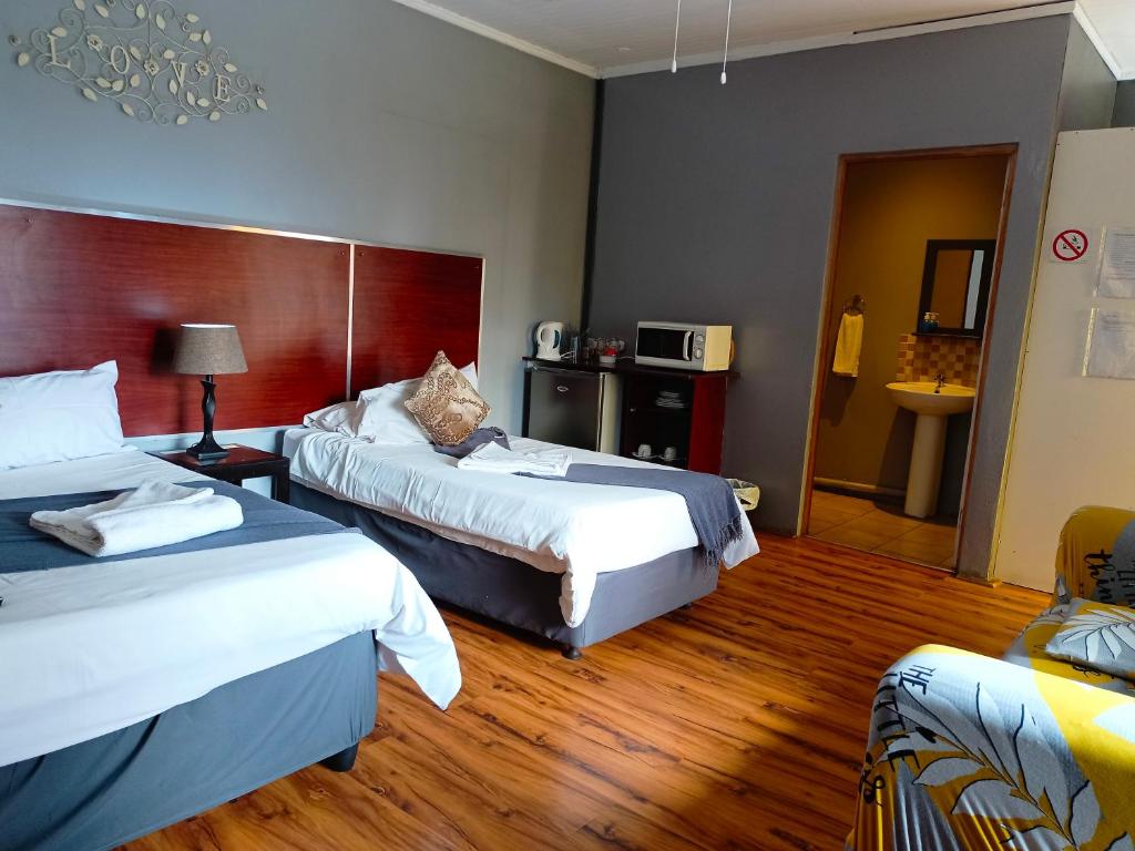 Family unit 2 interlinking rooms with 2 bathrooms . First room 1x king bed bath , tea/coffee station, micro wave, mini fridge, fan and DSTV. Second room with 2 single beds, shower, DSTV, fan, micro wave, mini fridge and tea/coffee facility.