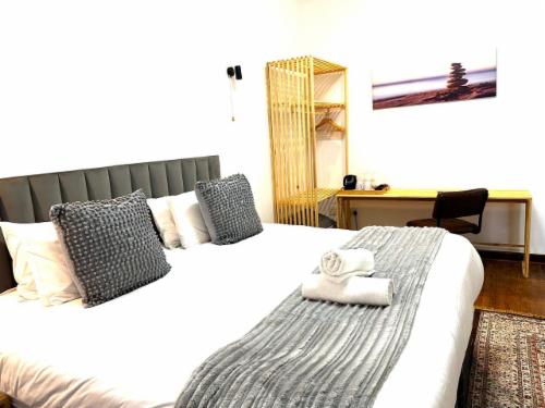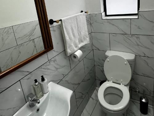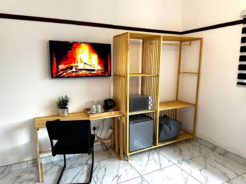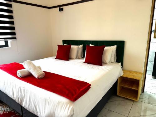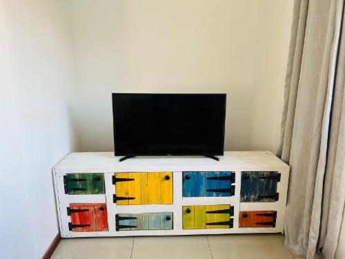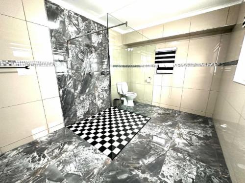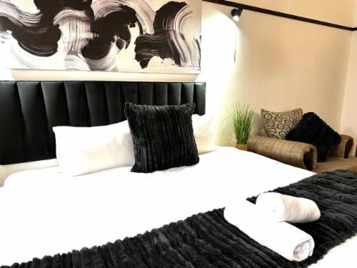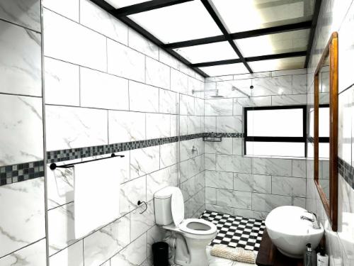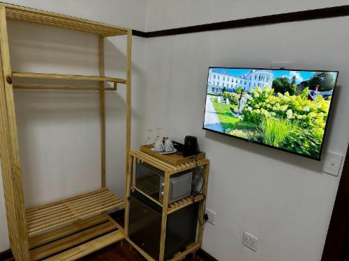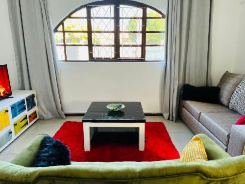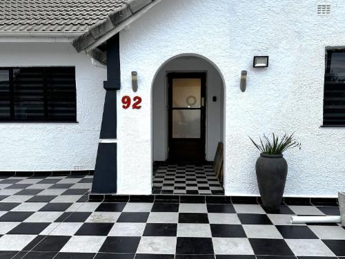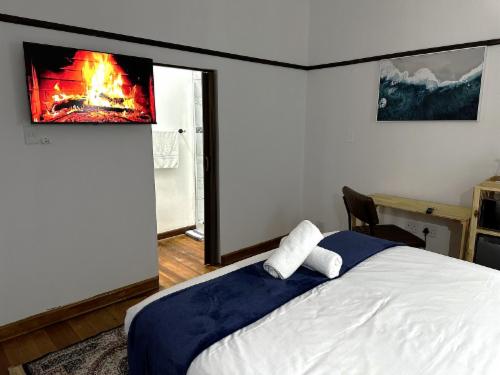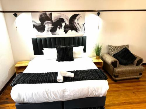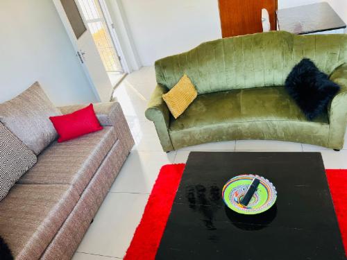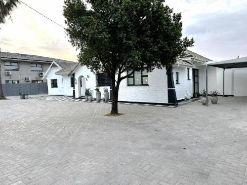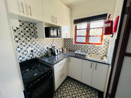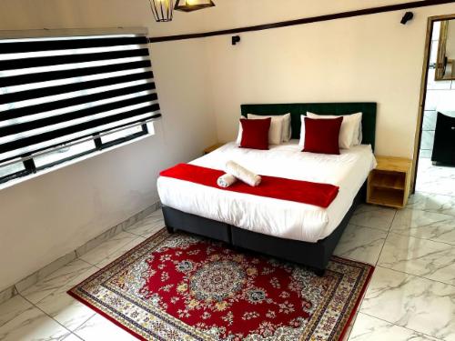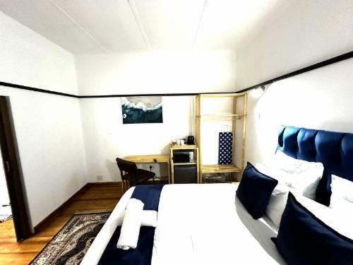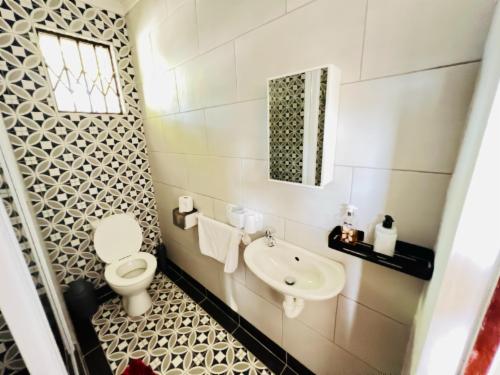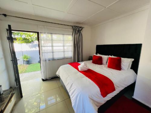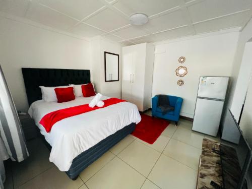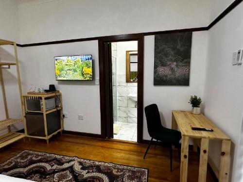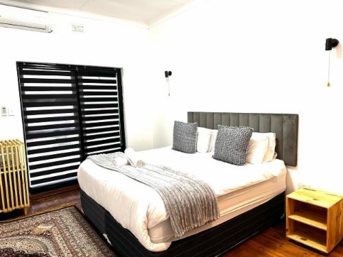 This room has a king-size bed which can convert to twin beds upon request. The room contains a private bathroom, air-con, a microwave, a bar fridge, and an inverter that powers lights and some plugs during load-shedding. A cot is available on request.